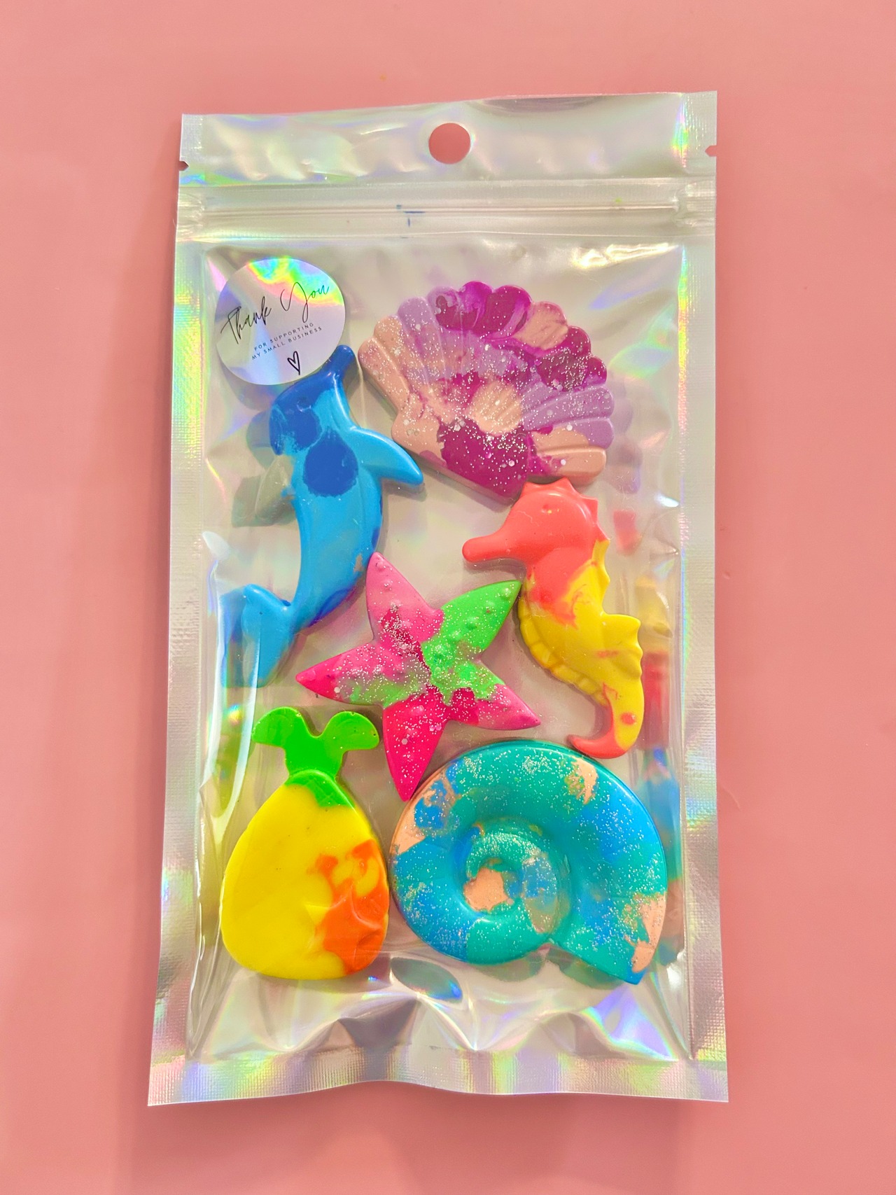 うみのいきもののカタチをしたクレヨンが6個入っています。 3個はラメ入りクレヨンです。